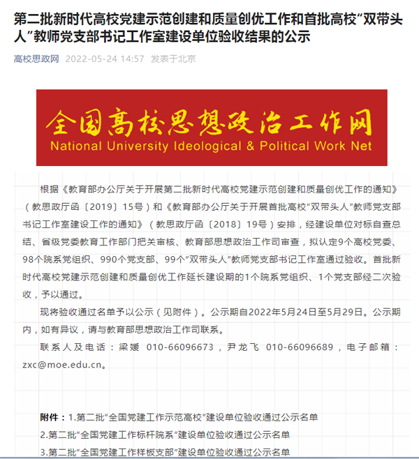 根据《教育部办公厅关于开展第二批新时代高校党建示范创建和质量创优工作的通知》(教思政厅函〔2019〕15号)安排,经建设单位对标自查总结、省级党委教育工作部门把关审核、教育部思想政治工作司审查,认定9个高校党委、98个院系党组织、990个党支部、99个“双带头人”教师党支部书记工作室通过验收。