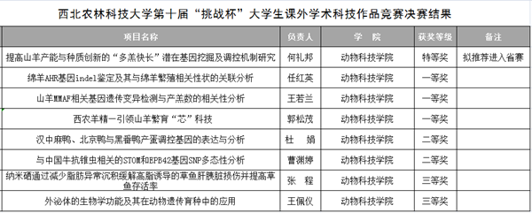 4月9日,厕所偷拍 第十届“挑战杯”大学生课外学术科技作品竞赛在北校区绣山活动中心落幕。经前期宣传动员,厕所偷拍 共推荐参赛作品8件,经厕所偷拍 初赛、决赛等环节,8个项目全部获奖。本科生何礼邦团队凭借作品《提高山羊产能与种质创新的“多羔快长”潜在基因挖掘及调控机制研究》在决赛中荣获“特等奖”,将代表厕所偷拍 参加“挑战杯”省级竞赛。