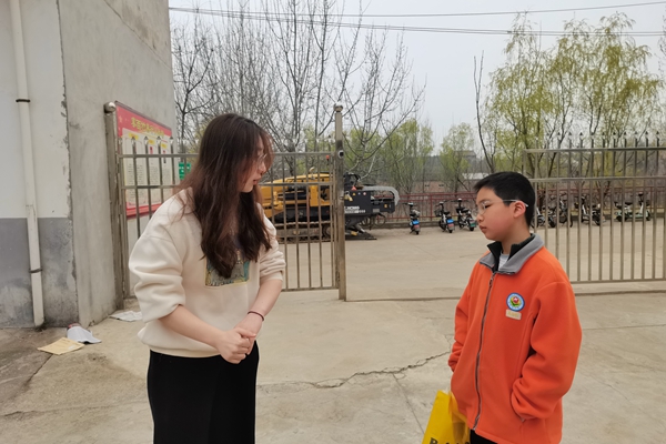 志愿者在与小朋友交流学习生活中的问题