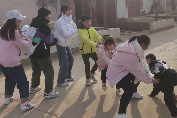到达寨东村后,支教志愿者们迫不及待地找到了自己对应小朋友的家,开始辅导小朋友们的课后作业。伴随着笔尖划过纸张的沙沙声,屋里时常传来小朋友疑惑的发问和志愿者们耐心的解答,或许是被小朋友们求知若渴的眼神所打动,温暖的阳光也慢慢透过窗户照在了温声细语讲解的志愿者们身上以及小朋友们从未停下的笔尖处。小朋友们的全神贯注和志愿者们的认真负责,使作业辅导结束的时间比预期早得多,所以小朋友们跟着自己的“小老师”来到了户外享受灿烂的暖阳。有些小朋友拉着“小老师”跑到了休息区,玩起了村里的健身设施,欢声笑语持续不断;其他小朋友们和“小老师”们玩起了老鹰捉小鸡的游戏,阳光洒在他们奔跑的身影上,活力且温暖。