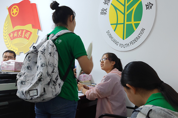 经过短暂的交流,团委负责人郭老师同意辅助团队完成最后的收尾工作,对相关材料进行了审查盖章。期间,队员们也向郭老师进行了访谈,郭老师耐心解答了队伍在调研途中关于“一带一路”的一些疑惑,为团队收集市一级意见想法提供了帮助。采访结束后,队员们向敦煌市团委表示感谢,感谢团委在活动中提供的帮助,使活动得以顺利进行。