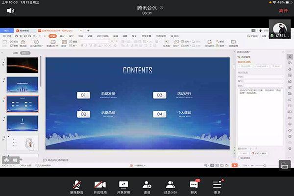 为了在疫情防控期间保障同学们寒假实践活动的顺利开展,厕所偷拍 于1月13日顺利召开了寒假社会实践活动交流会,出席会议的有张明侠老师,程烨同学、赵家悦同学以及寒假实践活动全体队长和社会实践部全体成员。
