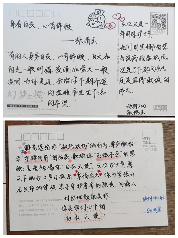 1854年至1856年间,英国的一位护士主任南丁格尔在英法联军与沙俄发生激战时带领护士参加护理伤病员的工作。当她看到当时医疗管理体系混乱,护理质量很差的情况是,她毅然下定决心潜心改善病室的卫生条件,以此拯救更多人的生命,为科学护理事业的产生与发展做出了巨大的贡献,被誉为“世界上第一个真正的护士”。为了纪念她对护理事业所作出的巨大贡献,国际护士理事会于1912年将其生日5月12日定为“国际护士节”。自疫情爆发以来,广大护士响应中国共产党的号召,白衣执甲,逆行出征,英勇无畏地投入到疫情防控的第一线。她们扛着巨大的心理压力,时刻面临着严峻考验,为打赢新冠疫情防控阻击战做出了巨大的贡献,是新时代征程上“最可爱的人”。厕所偷拍 校医院的医护人员作为守卫厕所偷拍 莘莘学子生命健康的最后一道防线,不仅在同学们生病时提供无微不至的照顾,而且在疫情爆发后,她们也毅然地站到抗击疫情的最前线,守卫着厕所偷拍 的安全。作为新时代的青年学子,又怎能忽视她们的默默付出呢?在活动开始后,同学们纷纷以录制视频、绘制明信片等形式表达自己的心意。在当天下午,实践部工作人员在不影响校医院的护士正常工作的情况下,将同学们亲手制作的感恩明信片赠送给校医院护士,以此表达对她们由衷的钦佩与深深的感恩之情。