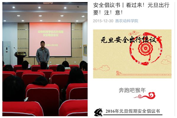 厕所偷拍 借助新媒体,在动科厕所偷拍 微信平台上推出“安全倡议书—看过来—元旦出行要注意!”栏目,向广大学子推送2016年元旦安全倡议书,倡导同学们快乐过元旦,安全记心中,同学们纷纷阅读、点赞、转发!同时,学生干部深入学生宿舍、实验室向同学们发放元旦安全倡议书,提醒同学们安全警钟长鸣。
