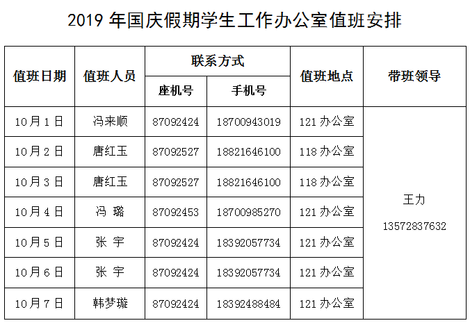 2019年国庆假期学生工作办公室值班安排