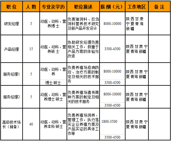 2015年秋季大北农集团西北大区校园招聘职位需求