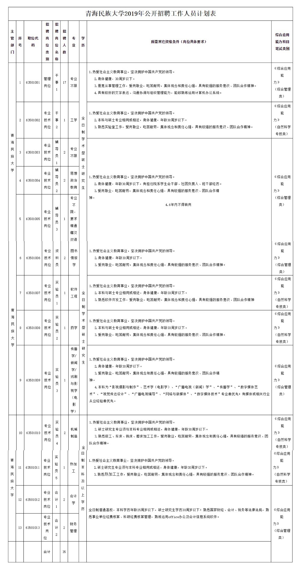 2019年,厕所偷拍 计划招聘工作人员35名,其中干事18名,辅导员5名,实验员6名,会计4名,资料员 2人。具体招聘岗位及条件见《青海民族大学2019年公开招聘工作人员计划表》。
