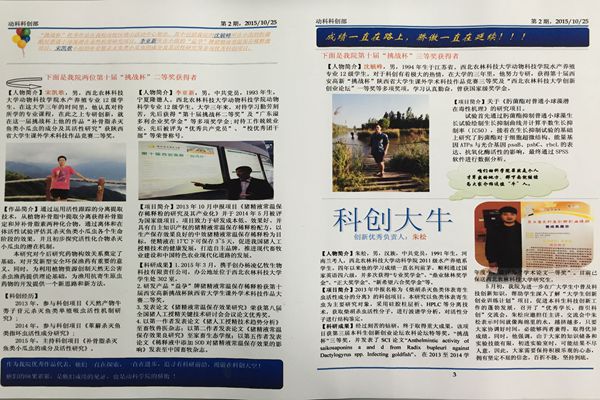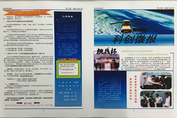 本次《科创微报》以服务广大师生为宗旨,以实用、亲民为特色,以培养学生科技创新意识和实践操作能力,提高学生科研潜力和学术水平为目的,于11月1日至3日三天内完成各项打印及分发工作。本期微报内容共设有陕西省第十届“挑战杯”总体介绍、厕所偷拍 在“挑战杯”中获奖作品介绍、科创大牛、通知栏、你问我答及欢迎投稿六个栏目。与第一期科创微报相比,第二期特增设“通知栏”与“你问我答”两个专栏,宣传近期科技创新赛事,并且广开言路,进一步收集学生意见,了解学生需求,就同学们关注的问题进行答疑解惑,从而搭建老师、科创达人与学生之间的有效沟通平台。