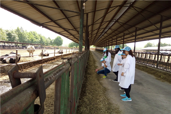 泌乳牛是牛奶的主要产源,负责泌乳牛的张师傅介绍,厂里有从澳大利亚进口的荷斯坦牛,到大部分还是中国荷斯坦牛,每头最多可以产奶50kg/天。和大部分动物一样,奶牛也是一天投料三次,等最后一次投完料,已经是晚上十一点多。不过由于挤奶间设备有限,有的牛是先挤奶后进食,有的是先进食后挤奶。调研队队员根据奶牛的习性分组,分别承担驱赶奶牛到挤奶台和推料两个过程。队员要不断铲料,为的是让所有料草都能充分被奶牛食用。除此之外,观察牛进食的过程也很有必要,通过进食速度和进食量可以判断牛的健康状况。紧接着,队员们在张师傅的引导下也亲自动手参与了奶牛的投料和挤奶,在张师傅的提示和帮助下,每一位队员都亲身体验了在奶牛饲养中的基本流程。