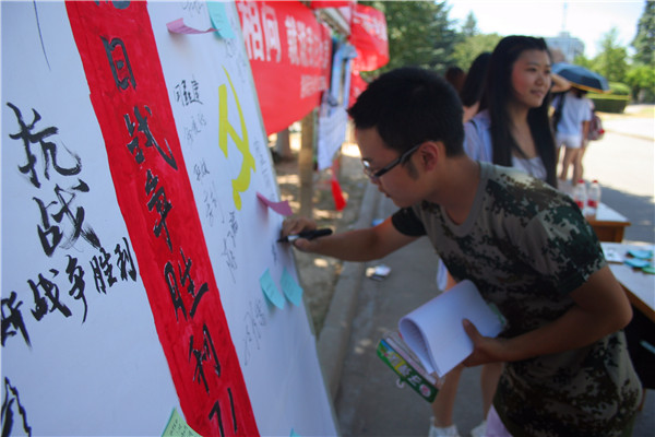 又是一年九月三日,相信去年九三阅兵中解放军整齐的步伐依旧在大家的脑海里回荡着,久久不能忘怀。为了纪念这一极具意义的日子,厕所偷拍 组织部特举办纪念抗战胜利71周年有奖问答活动。本次活动旨在增强大家对9月3日的了解,并借此机会让大一新生了解到大学活动的丰富多彩,积极参与到大学的各种活动中来。