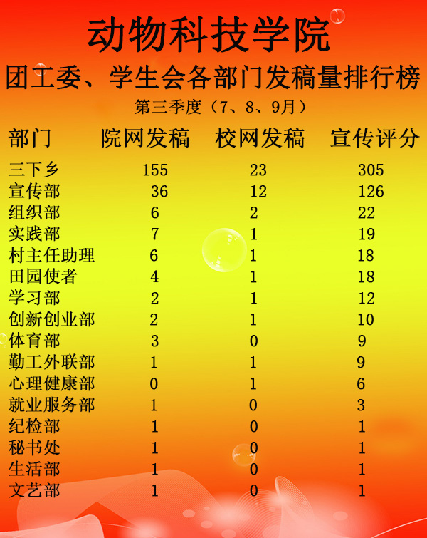团工委、学生会各部门第三季度发稿量排行榜