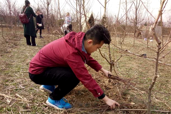 几月不曾见到合作社的桃树,如今的它们已无去年暂别时萧条的模样,处处焕发着生机,桃枝冒出些许新生的嫩芽,几朵桃花耐不住性子已经破苞绽放了。在这醉人的景色里,负责人员向同学们介绍了桃树现在的生长情况与接下来需要进行的工作,其中最主要的便是修剪桃枝这项技术活。修剪枝丫,旨在为桃树定形,要将树修剪得矮一些,促进它向外生长,使之在开花结果时能充分照射到阳光。这样不仅会让桃树焕发新生,而且能增加桃子的产量。在认真学习修剪桃树的技巧与注意事项后,同学们在工作人员的帮助下渐渐熟悉操作,帮助合作社完成这项工作。虽然此次活动只是短短的一天时间,但是队员们学习到了修剪桃树的技能,增强了社会实践能力,不虚此行。