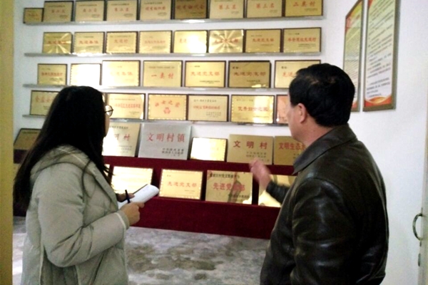 上午九点,两位在村委会办公室与原董家村书记董发乐、原半个城村书记梁建国、妇女主任杨英英会面,就两村合并事宜进行交流。董书记介绍了合并村现人口的基本构成的合并后的基本情况。半个城村与董家村合并命名为半个城村,共8条街道,338户人家,1580余名村民,78名党员,5个村民小组。村主任助理从董书记口中了解到,近年来各种惠农政策的普及使得村民的生活水平大大改善。村中年轻人多外出打工,在运输、工厂、服务业等处任职;村里已建有幸福院、第四幼儿园、党员活动室等基础设施;村庄周围正在进行市民中心、图书室、管委会的修建,村民的娱乐生活也会随之丰富起来。梁书记激动地说道,西农教授将杨凌交通问题反映到上级中央,今年杨凌的专业车道也将启动,将为村民出行提供更大的便利。梁书记还展示了村子历年所获奖项和2017年目标责任书,并和村主任助理沟通和计划了参与进村子的娱乐活动。他们相信,在双方的合作努力下,一定能更好地推进合并村的建设与发展。