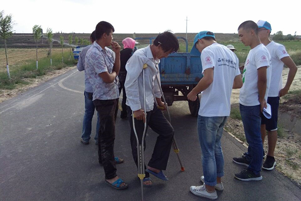 队员正在热切的慰问行动不便的大叔