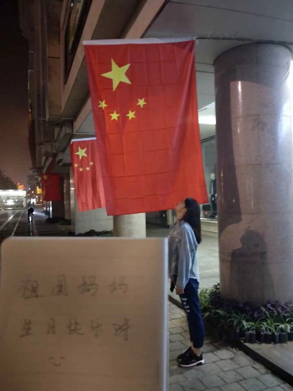 学生与国旗合影并写下祝福