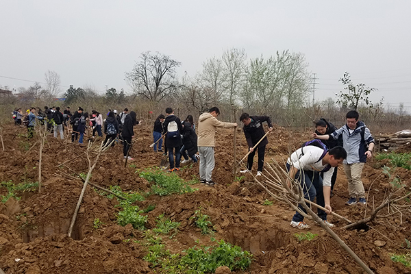 进入村子里,锄头、铁楸一应俱全,男生挖树坑,抬水,女生负责插树苗,填树坑。经国本,解民生,尚科学的九字箴言在同学们脑中回响,大家似乎忘记了春寒料峭,奋力干着。片刻之间,一大片土地便插满了女贞树苗,远远望去,蔚为壮观。