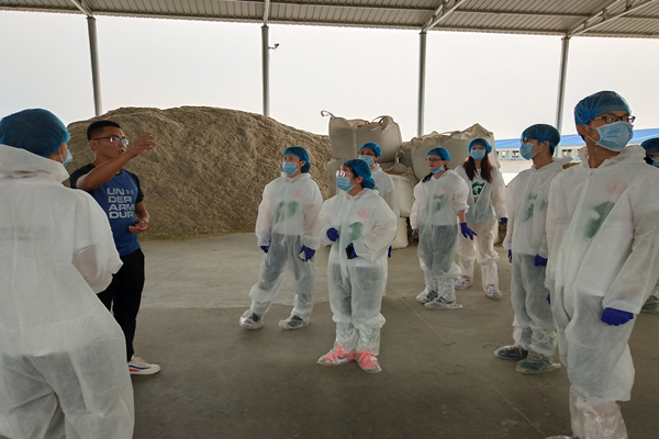 参观完饲料处理厂房后,李总带领大家来到了药材室和消毒室。队员们清晰地看到摆放在地下的经过分类汇总后的药剂。经过讲解,大家了解到这些药物就是昨天参观奶牛挤奶时所用的清洗药物。
