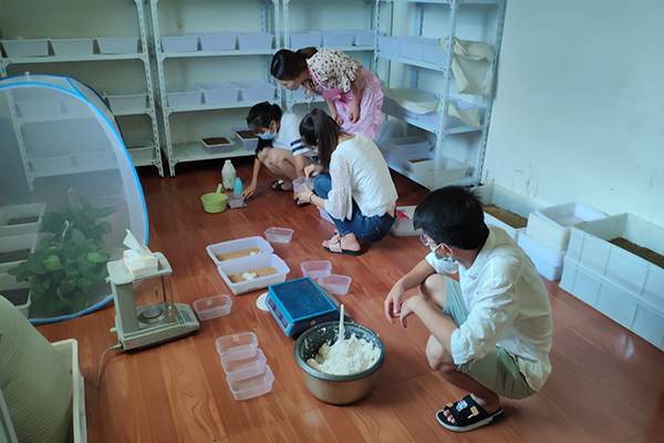 刚开始步入实验室的时候队员们对实验项目不了解,对实验原理和实验操作充满疑惑,学长学姐们见此情况便向队员们进行详细讲解。队员们在校虽然还没有接受到系统专业的实验知识学习,对学长学姐们讲解的内容也是半知半解,但是在研究生的耐心解释之下却也有所收获。随后队员们便根据研究生的指导,进行实践操作。在调研队成员体验投喂工作时,研究生向调研队成员详细讲解了投喂的的原则--定点、定时、定量。这几个词理解起来很容易,但是做起来却需要足够的毅力以及耐心。这也让队员们明白一个实验的成功并不是想象中那么简单,它需要日积月累,需要实验者的坚持。对于本科生而言没有足够知识来进行实验,但能和研究生一起交流,却也是一种很好的学习方式。