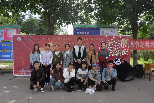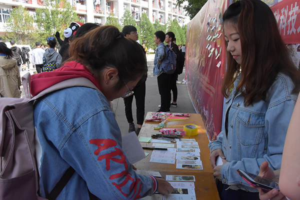 活动现场采用多种方式进行宣传,包括有奖问答、即兴红歌演唱、与玩偶合影以及在红色横幅上签名留念、发放金秋科技文化艺术节宣传单等。其中,活动介绍和活动报名环节更是本次宣传活动的一大亮点。