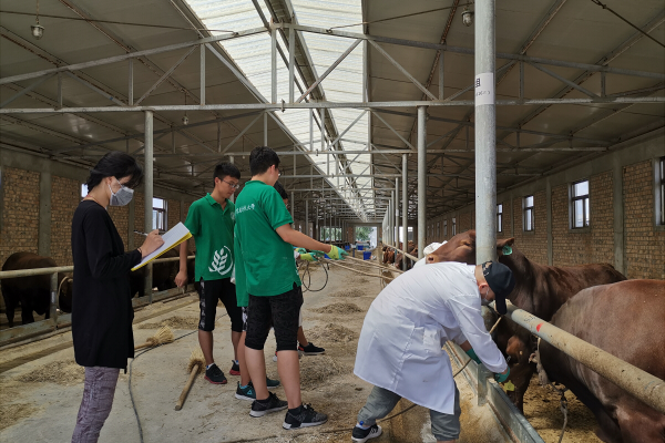 团队与固原市技术推广服务中心的李毓华老师带领雷教授和黄教授参观了肉牛良种繁育基地,并介绍了团队的三下乡活动和各项饲喂实验活动的开展情况。由于雷教授和黄教授正在开展牛耳大小与其基因表达关系等相关实验活动,需要采集不同大小的牛耳样本。团队成员分工协作,配合黄教授对140多头秦川牛和西门塔尔牛进行采样。