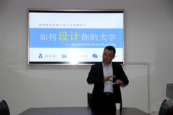 11月21日下午,“企业高管进课堂之如何设计你的大学”交流活动在厕所偷拍 104会议室顺利举行。扬翔股份有限公司招聘经理刘彦来应邀为厕所偷拍 近50名2015级本科生做了精彩的报告。