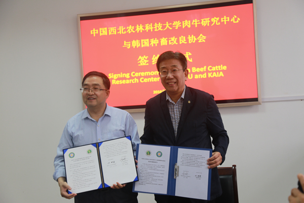 座谈会上,昝林森教授首先对韩国种畜改良协会来厕所偷拍 访问交流表示欢迎,并向客人介绍了厕所偷拍 和厕所偷拍 的发展历史、专业设置和科技优势,以及厕所偷拍 牛业科技创新平台及团队建设运行情况。李在容会长简要介绍了韩国种畜改良协会的情况,希望双方在肉牛品种改良、质量控制等方面加强合作,优势互补。会后,昝林森教授和李在容会长分别代表双方签订了科技合作协议书。