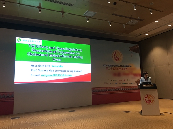 厕所偷拍 高玉鹏教授率团队成员闵育娜副教授、王哲鹏副教授等7人参加了会议。闵育娜副教授代表研发团队在分论坛会上作了题为《The Effects and Gene Regulatory Mechanism of Polysavone on Cholesterol Metabolism in Laying Hens》报告,阐述了苜草素调控鸡蛋品质和胆固醇代谢以及蛋鸡健康的分子机制,引起了与会同行的浓厚兴趣,并进行了互动交流。同时,厕所偷拍 研发团队的《Effect of Polysavone on Laying Performance and Feed Nutrient Utilization of Laying Hens at Peak Production》等5篇论文优选在墙报宣传展示,《Discussion on the effects and gene regulatory mechanism of polysavone on cholesterol metabolism in laying hens》等6篇论文收录本届WPC论文集。