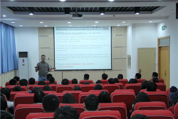 结合自身科学研究经历,马丁教授带同学们感受科学的魅力所在。通过对一种鱼类在同一地区不断扩散栖息地最终形成新种的研究过程,发现其对不同栖息地类型(淡水、H2S富集水域以及洞穴)的快速适应,使其形态学、身体颜色等特征发生显著改变,进而在配偶选择以及捕食者压力方面出现明显差异,最终出现生殖隔离,这就是科学的魅力所在。马丁教授的讲解使同学对创新意识大大提高,并就如何作出一篇优秀的科创报告、如何看待实验中出现的失误等问题与马丁教授进行交流。