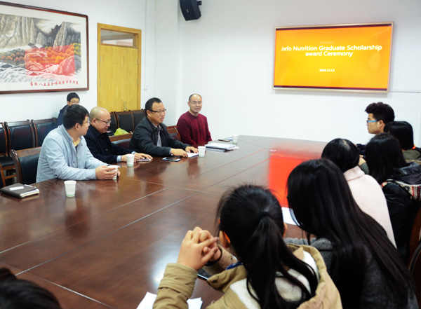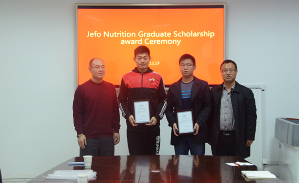杨小军教授、蔡传江博士以及动物营养与健康养殖科研创新团队成员出席颁奖仪式。研究生颜陶、郭伟荣获2016年“Jefo营养研究生奖学金”。