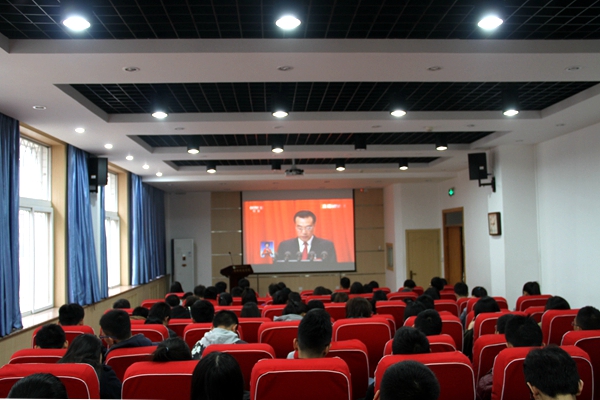 同学们认真听取了李克强总理对2016年工作的回顾,目标任务完成情况,取得的成绩与存在的不足,以及2017年国家的主要工作目标与工作重点。大家一边细心聆听报告,一边在记录本上详细记录表达感想,深入思考。直播会议结束后,团学干部结合实际学习生活经验,纷纷热议政府工作报告,分享自己的心得感悟。