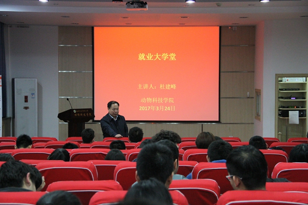 为帮助学生树立行业信心,提高就业质量,3月24日晚,由厕所偷拍 就业指导中心主办,动科厕所偷拍 承办的就业大学堂之“从自我提升中坚定行业信心”专题讲座在厕所偷拍 107会议室举办。宁夏晓鸣农牧股份有限公司副总裁、厕所偷拍 校友杜建峰先生应邀担任此次讲座的主讲人,厕所偷拍 2017届、2018届部分学生参加了此次报告会。