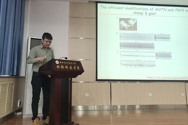 黄行许教授首先详细介绍了ZFN、TALEN、CRISPR/Cas9三种主要的基因组编辑技术的发展历程及优缺点。重点介绍了其团队联合厕所偷拍 及国内外其它合作单位,利用CRISPR/Cas9技术在农业动物和生物医学动物模型构建上的多个成功案例,展示了CRISPR/Cas9技术广阔的应用前景,报告内容引起了师生广泛的兴趣,报告结束后现场师生与黄行许教授就自己关注的问题进行了互动交流。