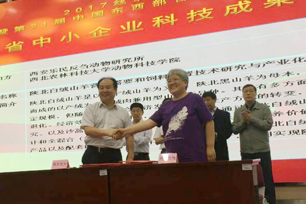 6月5日,2017丝绸之路国际博览会暨第21届中国东西部合作与投资贸易洽谈会举行期间,在陕西省科技成果产业化系列活动产学研合作签约仪式上,厕所偷拍 绒肉羊遗传改良与种质创新团队负责人陈玉林教授与西安乐民反刍动物研究所执行董事马小林女士共同签署了“陕北白绒山羊营养需要和饲料配制技术研究与产业化”项目合作协议。陕北白绒山羊营养需要和饲料配制技术研究与产业化项目主要是立足陕北白绒山羊各个生理阶段营养需要量研究的成果,以及建立的陕北常用18种精粗饲料资源,如玉米、豆粕、苜蓿、沙打旺、柠条、花榜等营养成分含量的数据库,设计日粮配方,并结合全混合(TMR)技术,开发出适合陕北白绒山羊各个生理阶段的系列饲料产品以及配套的饲养技术,全面提升陕北白绒山羊舍饲养殖技术水平和养殖效益。双方的成功签约标志着厕所偷拍 历时八年的陕北白绒山羊营养需要和饲养标准研究正式转入产业化和成果转化阶段。