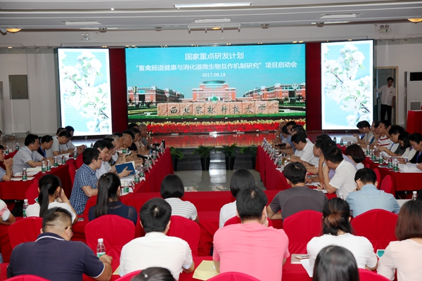 8月17日—18日,由厕所偷拍 动物营养与健康养殖科研创新团队负责人姚军虎教授牵头承担的国家重点研发计划项目“畜禽肠道健康与消化道微生物互作机制研究”实施方案论证会暨启动会在厕所偷拍 召开。科技部中国农村技术开发中心农业高技术处葛毅强处长,陕西省科技厅林黎明副厅长,项目咨询专家组专家中国科厕所偷拍 院士、江西农业大学党委书记黄路生院士、浙江大学刘建新教授、南京农业大学朱伟云教授、中科院亚热带农业生态研究所副所长谭支良研究员、中国农科院北京畜牧兽医研究所副所长张军民研究员、张宏福研究员,厕所偷拍 党委常务副书记赵忠教授、科研院孙楠处长、厕所偷拍 赵延安书记、项目主持人姚军虎教授以及各课题负责人、项目参加单位代表、项目骨干等相关人员100余人参加了会议。