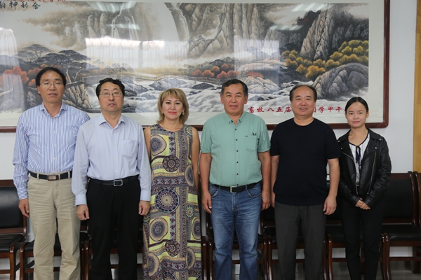 与北哈萨克斯坦动物与作物研究所Ayup Iskakov所长(右三)、国立大学农厕所偷拍 院长Altyn Shayakhmetova教授(左三)合影