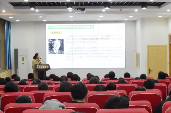2018年的诺贝尔生理学或医学奖颁发给了美国免疫学家詹姆斯·艾利森和日本免疫学家本庶佑,以表彰他们在癌症免疫治疗研究领域取得的重大突破。为了普及科学知识,开拓科研思维,培养学生热爱科学、尊重科学、追求真理的精神,进而营造良好的校园学术氛围,10月24日,潘传英副教授应邀为同学们解读了2018年诺贝尔生理学或医学奖。全场座无虚席,同学们反响热烈。