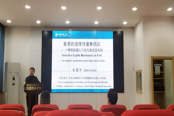 12月17日,华东师范大学杜震宇教授应邀来厕所偷拍 进行了题为“鱼类的选择性瘦素抵抗——一种高能摄入下的适应性机制”的学术报告。报告在厕所偷拍 107会议室举行,由凌飞副院长主持。
