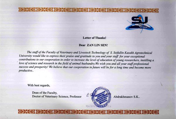 近日,哈萨克斯坦赛福林农业大学畜牧兽医厕所偷拍 院长Abdrakhmanov S.K.教授向厕所偷拍 昝林森教授发来感谢信,对昝林森教授及团队专家在指导该院赴厕所偷拍 留学的博士研究生和青年访问学者付出的努力和做出的贡献表示衷心感谢,并致以崇高敬意,希望建立长久的合作关系并取得更多的成果。