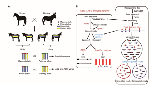 基因组序列中遗传变异的积累导致表型多样性和适应性进化,如牦牛高海拔低氧环境的适应性,以及马奔跑的爆发能力等。而大多数遗传变异是通过基因表达起作用,因此比较近缘物种牛和牦牛以及马和驴基因表达以及基因选择性剪接的差异,有助于解析其表型差异的遗传基础。但环境因素也是影响基因表达的一个重要因素,并且会干扰物种之间由于遗传差异导致的基因表达差异的比较。近缘物种的种间杂交个体包含两个近缘物种的遗传物质,受到相同的反式作用因子调控,其表达差异完全是因为两个近缘物种遗传差异导致。因此可以很好地避免反式因子的影响,为种间基因的比较提供了良好的模型。本研究开发了通过近缘物种比较等位基因差异表达和等位基因差异选择性剪接的分析流程。