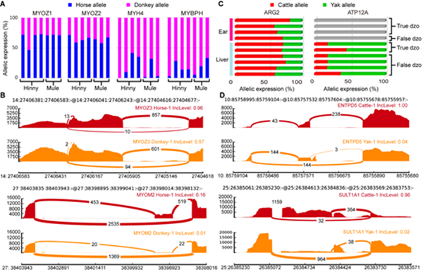 此研究利用大型哺乳动物(马( Equus caballus )×驴( Equus asinus )(骡子)和牛( Bos taurus )×牦牛( Bos grunniens )(犏牛))杂种动物,探讨了基因表达在适应性方面的变化演化。马和驴的共同祖先生活在距今400-450万年前,其在肌肉力量上表现出了分化,马在短距离内表现出更强的爆发力而驴在更长的距离上表现出更大的耐力。牛和牦牛分歧约490万年之前,最显着的差异这些物种之间是牦牛适应高海拔的能力环境。研究提供了包括来自马×驴(骡子)的皮肤、肌肉和脑3种组织的19个转录组数据以及来自牛×牦牛(犏牛)的耳和肝脏组织的10个转录组数据来分析互交杂种个体等位差异表达基因和等位差异选择性剪接基因的详细特征。结果显示,在骡子和犏牛中4.8%-8.7%的基因表现出等位基因差异表达而10.8%-16.7%基因呈现等位基因差异可变剪接。等位差异表达基因具有组织特异性, lncRNA和假基因相比蛋白质编码基因更可能表现为等位基因差异表达现象。