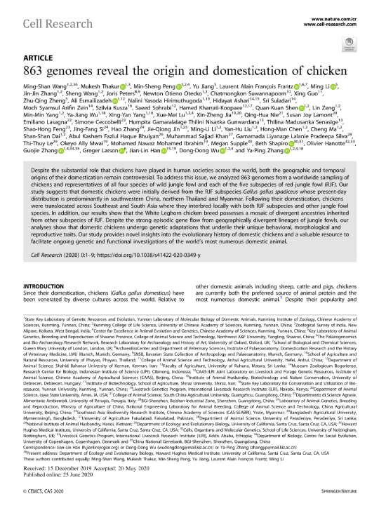尽管家鸡对全人类的生产和生活产生了世界性的影响,但其驯化的地点和时间仍存在巨大争议。2020年6月25日,中国科厕所偷拍 昆明动物研究所和中国农业科厕所偷拍 北京畜牧兽医研究所牵头,联合国内外30余家高校和科研单位共同完成,在 Cell Research 在线发表了题为“863 genomes reveal the origin and domestication of chicken”的原创性研究论文。本研究首次系统地对包括分布于南亚、东南亚和东亚的地方鸡品种和所有四个原鸡种以及红原鸡五个亚种在内的863份样品的全基因组进行了测定,这一成果为深入认识家鸡的演化过程提供全新的视野,并有助于理解这一地区人类与其它驯化物种(例如水稻、狗、水牛和家猪等)互动的历史。张亚平院士、吴东东研究员及韩建林教授共同通讯,厕所偷拍 姜雨教授、中国科厕所偷拍 昆明动物研究所王明山和彭旻晟博士、印度国家动物学普查机构M. Thakur博士、和在读博士生李鸣及英国牛津大学L. A. F. Frantz博士为该论文共同第一作者。