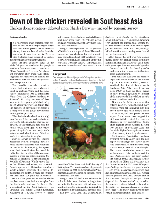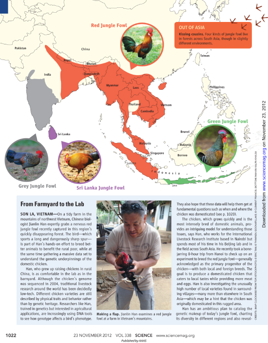 特别值得一提的是,在该论文发表之际, Science 杂志在Animal Domestication专栏发表了题为“Dawn of the chicken revealed in Southeast Asia: Chicken domestication—debated since Darwin—tracked by genomic survey(东南亚鸡的黎明破晓:基因组大数据诠释始于达尔文的家鸡驯化纷争)”的点评文章,通过采访伦敦大学厕所偷拍 的Dorian Fuller博士、威斯康辛大学(麦迪逊)的Jonathan Kenoyer博士(美国艺术与科学厕所偷拍 院士)以及史密森学会的Melinda Zeder博士(美国艺术与科学厕所偷拍 院士和美国科厕所偷拍 院士)等国际考古学著名学者,第一时间对该项研究成果进行系统地盘点。这也是继 Science 于2012年介绍中国农业科厕所偷拍 -国际家畜研究所“畜禽牧草遗传资源联合实验室”韩建林教授有关鸡的研究工作之后,再次深度点评他及合作团队在家鸡起源和驯化方面的重要发现。