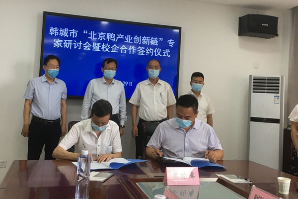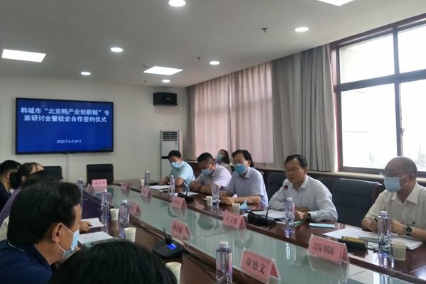 会上,韩城市副市长王文俊同志高度肯定刘小林团队近五年来对韩城市北京鸭产业发展所做出的努力和贡献,并提出了针对未来韩城市鸭产业的振兴发展提出了建议和意见。刘小林教授代表团队对近五年来对韩城市鸭产业科技服务进行了总结,并对校企进一步深度合作提出了新思路。同时,双方签约校企合作项目,为进一步校企合作事宜达成意向。